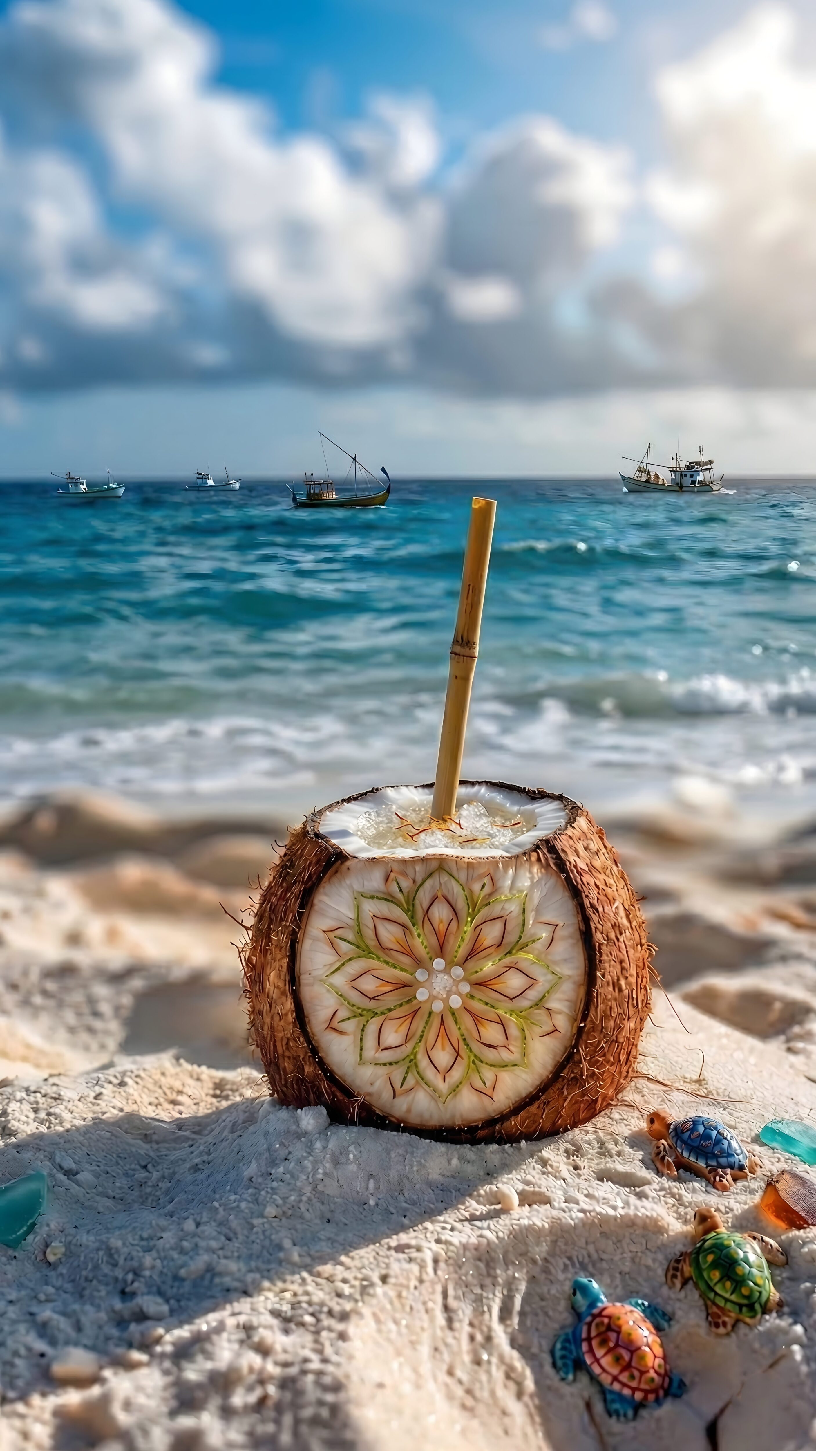 If you are craving a relaxing summer getaway, this vibrant digital creation delivers the perfect ocean vibe straight to your screen. The artwork features an incredibly detailed coconut resting on white sand, boasting a beautiful floral mandala carving right into its shell. With a natural bamboo straw poking out and tiny, colorful sea turtle figures scattered around the base, the entire scene feels completely magical and inviting.