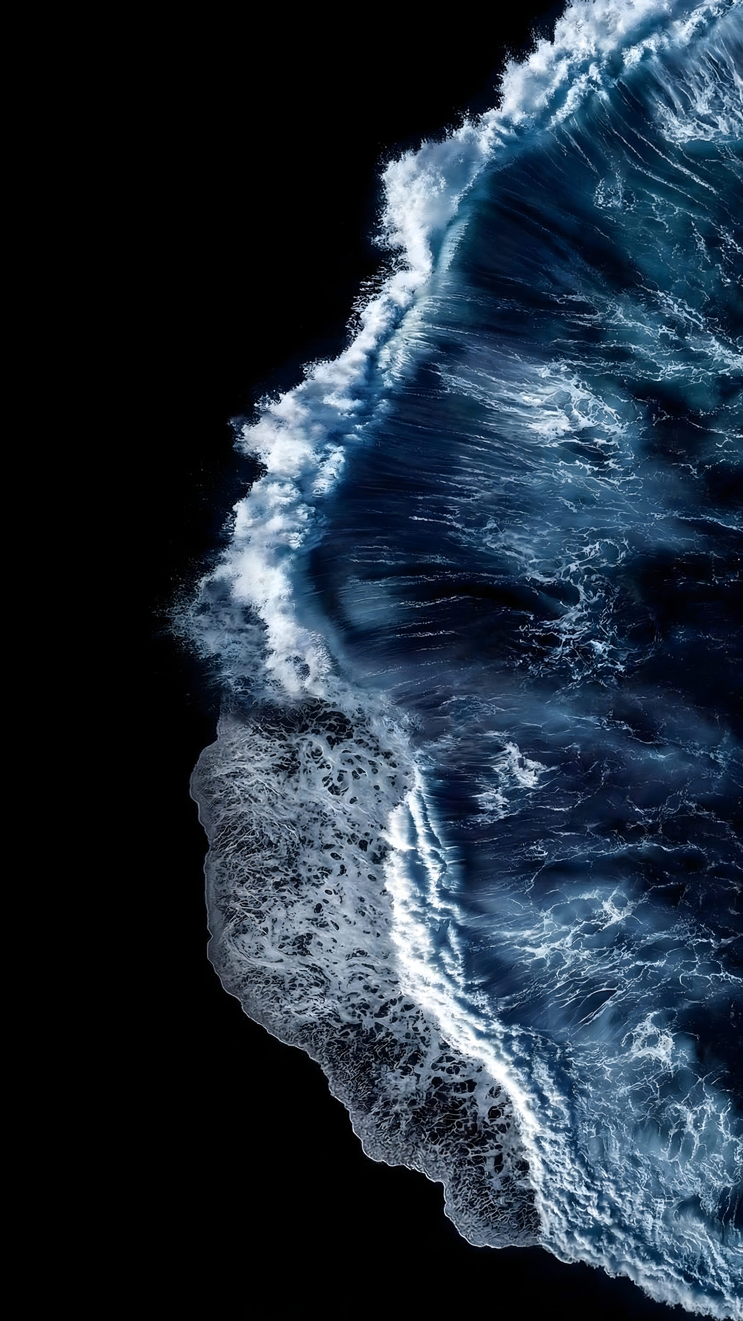 The water isn’t tropical turquoise; it is a deep, dangerous blue that fades into the black void. The white foam patterns act like veins of energy, cutting through the darkness. It’s the perfect background for those who appreciate the raw, untamed power of nature.