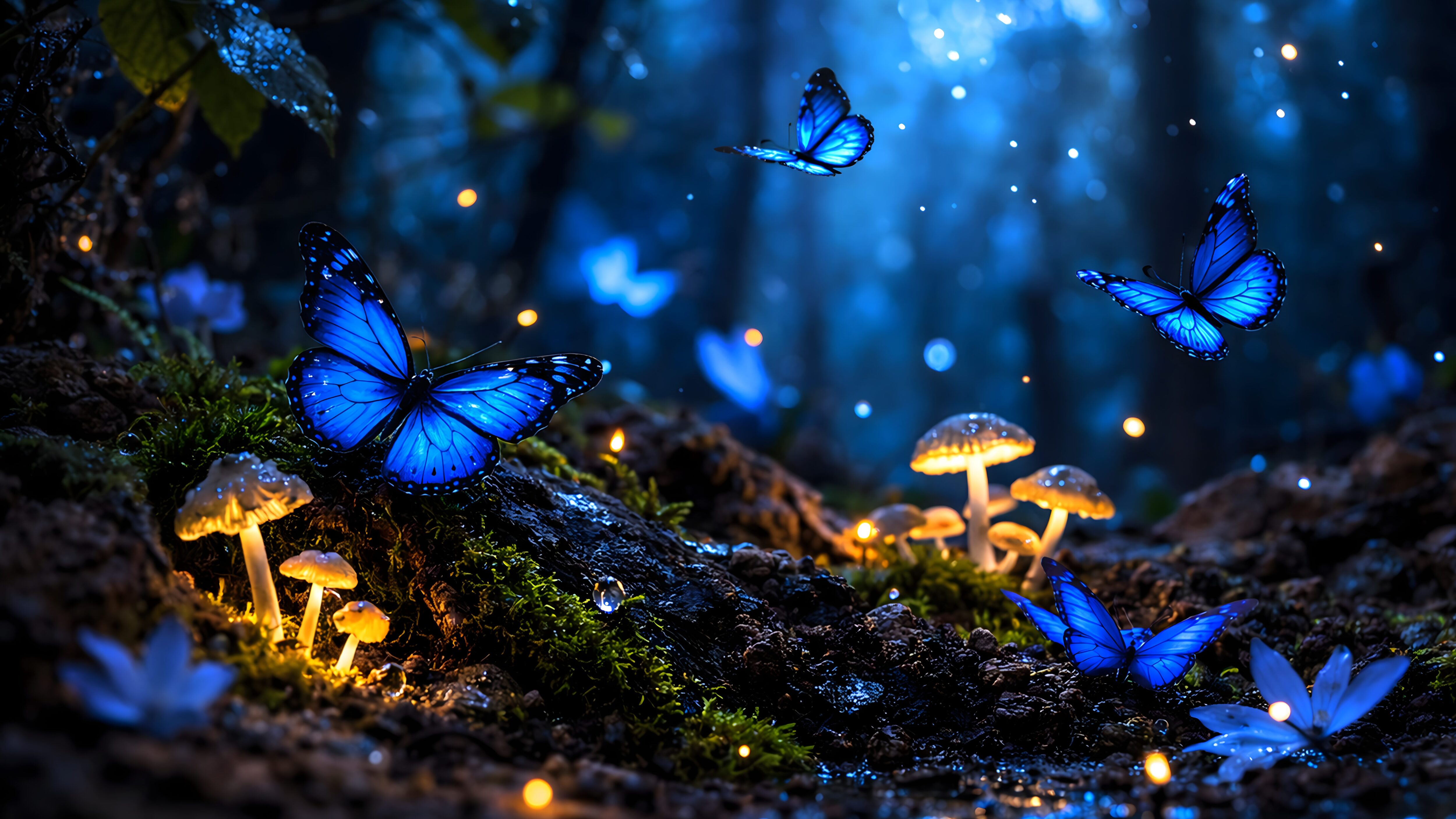 Give your workspace or personal computer screen a profoundly magical, incredibly aesthetic, and deeply relaxing upgrade with this breathtaking fantasy artwork. This perfectly optimized 4K Ultra HD PC desktop background from 4K Mobile Wallpapers features a spectacular digital render of an enchanted dark forest. The scene is beautifully illuminated by magnificent glowing blue butterflies and mystical glowing mushrooms resting on the mossy forest floor. Professionally enhanced and optimized to deliver perfect dark tones and vibrant neon colors, this dreamy masterpiece is the ultimate choice for high-resolution monitors and ultrawide displays worldwide, turning your desktop into a fairy tale.