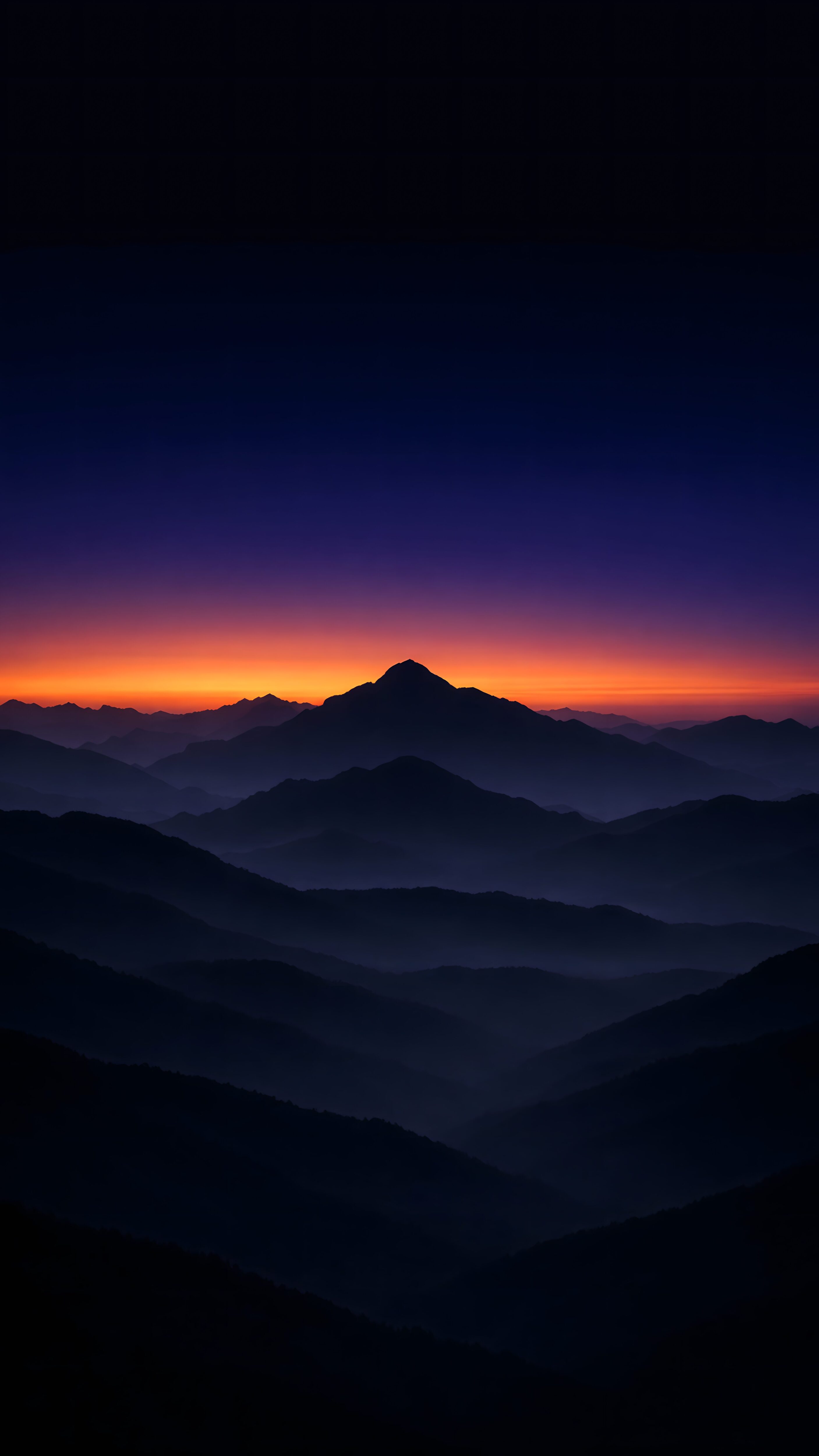 “Vertical digital art, minimalist layered mountain silhouettes fading into the distance with atmospheric mist, vibrant orange and purple sunset gradient transitioning into a deep blue night sky, flat vector style, dark nature aesthetic, 4k wallpaper –ar 9:16 –v 6.0”