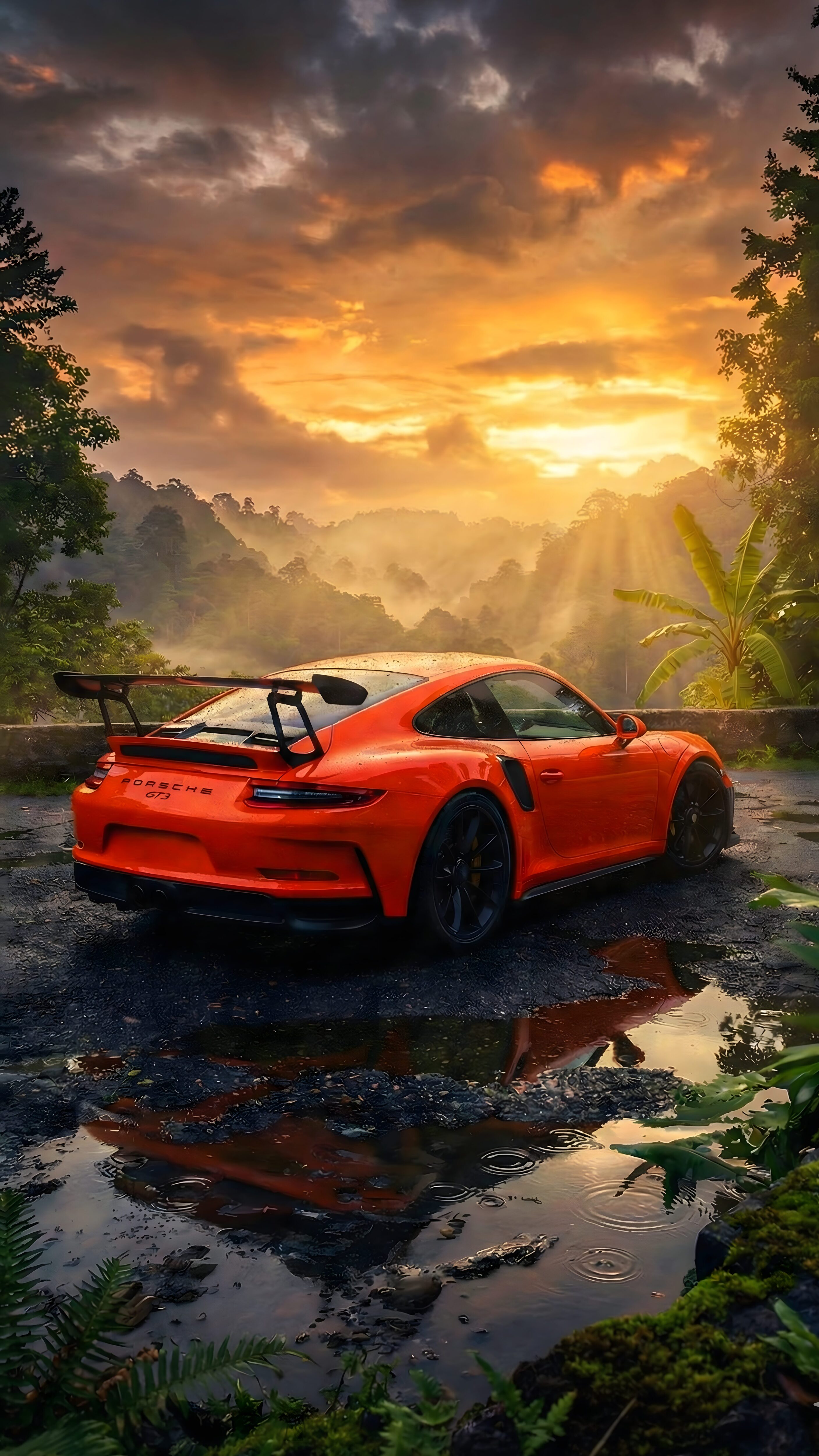 Orange Porsche GT3 Sunset 4K: Nature Aesthetic Car Wallpaper