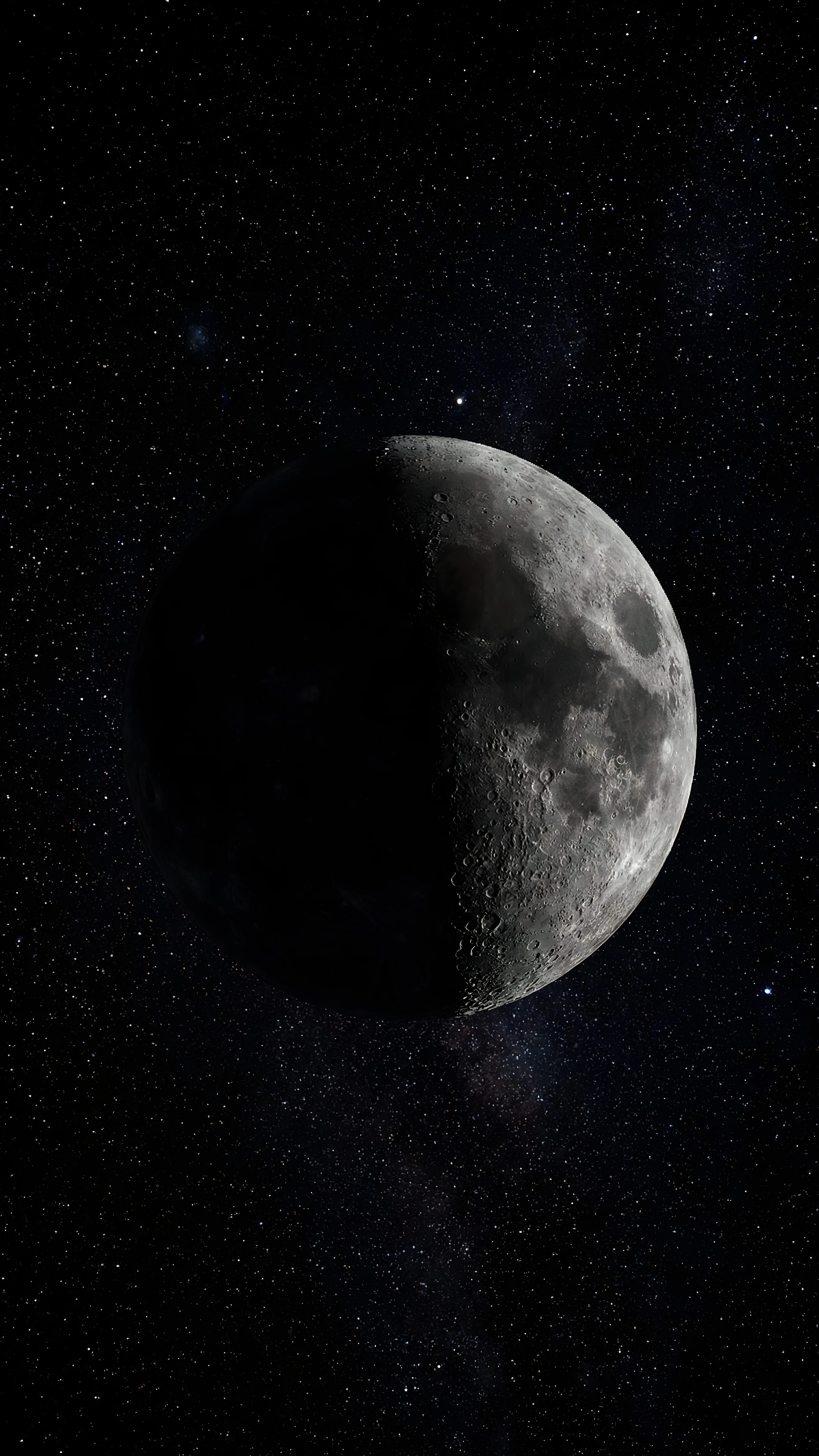 Give your smartphone screen a profoundly mysterious, incredibly cinematic, and deeply astronomical upgrade with this breathtaking space photography artwork. This perfectly optimized 4K Ultra HD phone wallpaper from 4K Mobile Wallpapers features a spectacular highly detailed render of a realistic half-illuminated moon. The stunning texture of the lunar craters is beautifully contrasted against the vast, infinite pitch-black space filled with glowing distant stars. Professionally enhanced and optimized to deliver perfect true blacks and crisp celestial details, this dark aesthetic masterpiece is the ultimate battery-saving choice for high-resolution OLED and AMOLED displays worldwide.