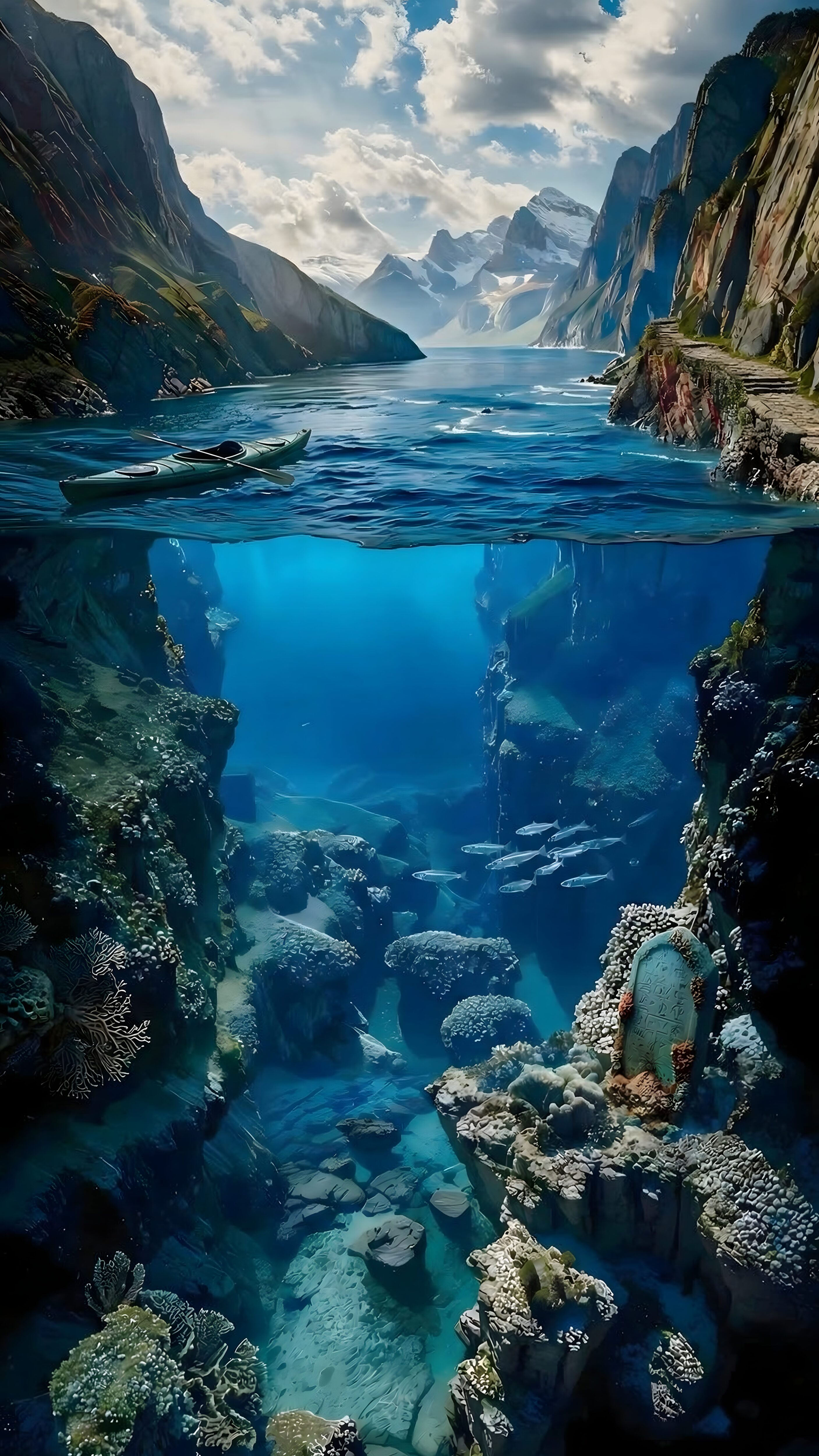 Experience the ultimate visual escape every time you unlock your phone. This breathtaking split-view background seamlessly blends two completely different worlds into one stunning image. Above the surface, you get a peaceful view of a lone kayak floating on a calm mountain lake under a bright sky. Below the water line, a deeply immersive blue canyon reveals a hidden ecosystem filled with swimming fish, rich corals, and ancient stone ruins.