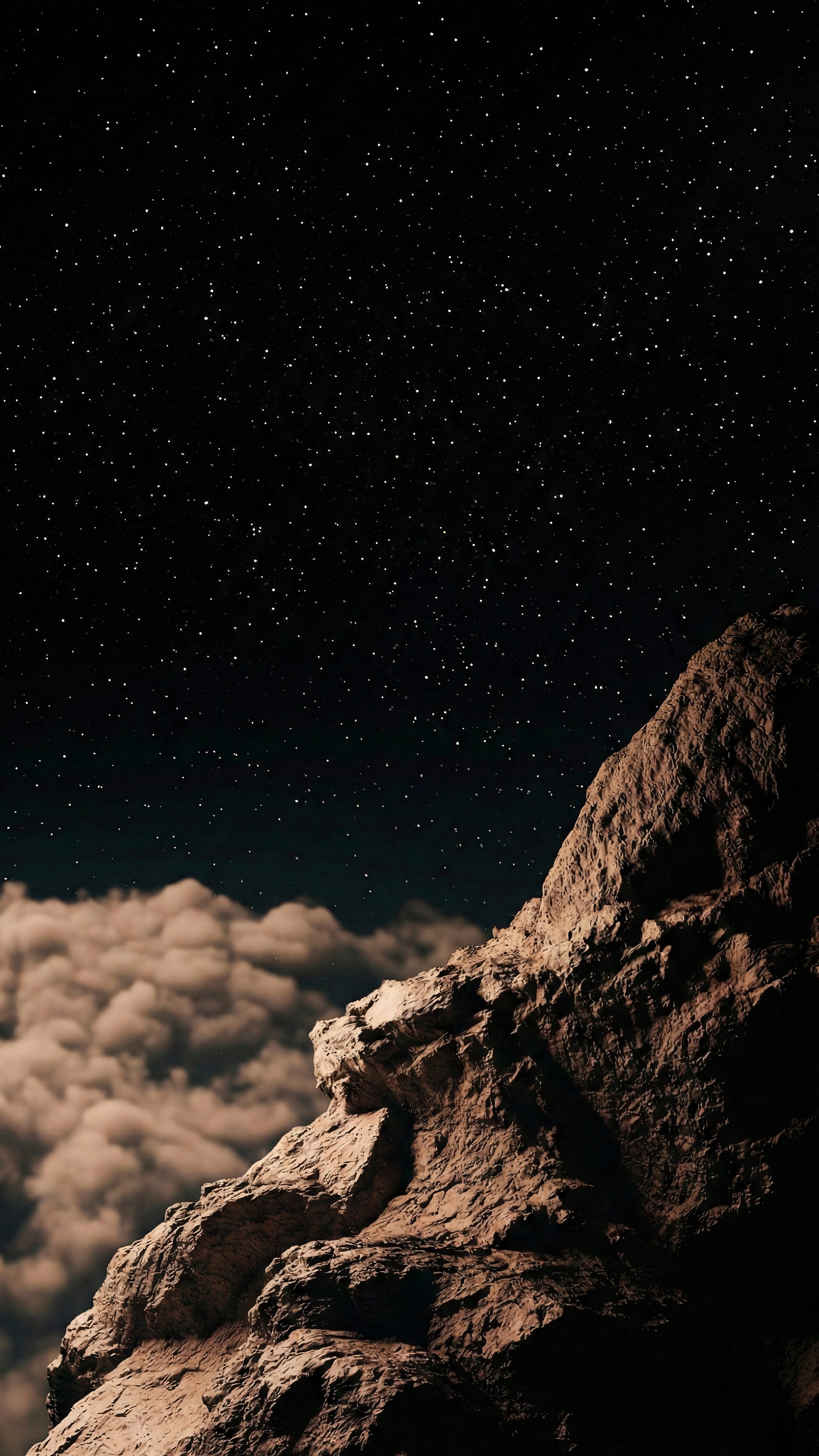 Give your smartphone screen a profoundly cinematic, incredibly majestic, and deeply mysterious upgrade with this breathtaking digital artwork. This perfectly optimized 4K Ultra HD phone wallpaper from 4K Mobile Wallpapers features a spectacular digital render of a highly textured rugged rocky peak overlooking a thick sea of dramatic clouds. Above it all stretches an infinite, pitch-black space sky filled with glowing stars. Professionally enhanced and optimized to deliver perfect true blacks and crisp geological details, this space aesthetic masterpiece is the ultimate battery-saving choice for high-resolution OLED and AMOLED displays worldwide.