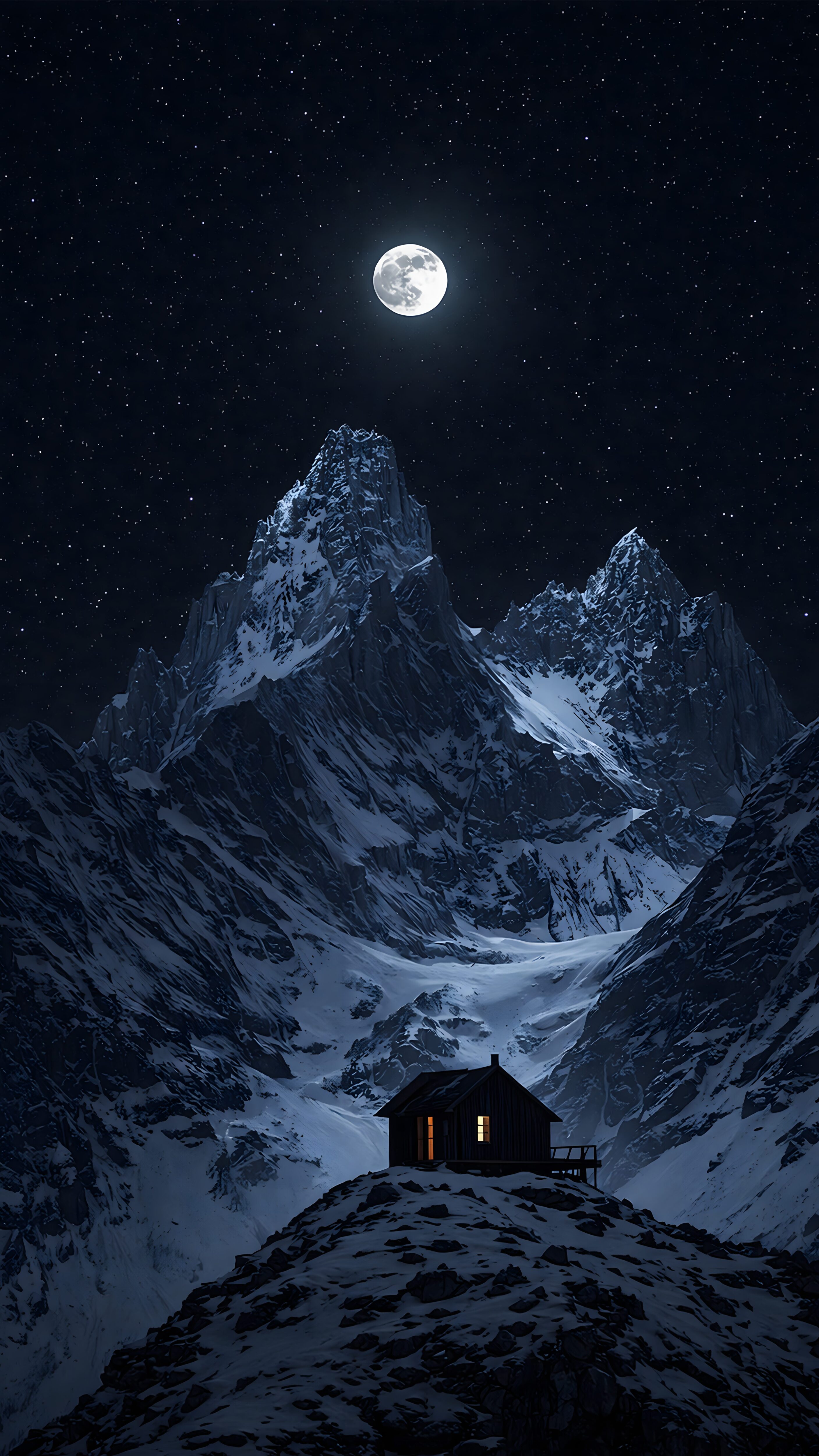 There is a profound sense of peace hidden in absolute isolation. This **Winter Mountain Cabin Night Wallpaper** perfectly captures the breathtaking and cinematic beauty of a cold, silent night. The digital masterpiece features a majestic, snow-covered alpine peak illuminated beautifully by a bright, glowing full moon and a sky full of stars.